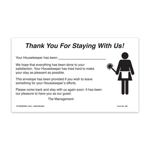 Maid's tip envelopes are great for reminding your guests to leave a gratuity for the maid and housekeeping staff in a considerate fashion. Dimension: 5.5" x 3.2". Sold 500 per box.