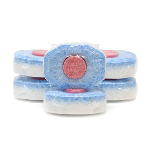 Perfect for extended stay properties which offer rooms with kitchenettes and dishwashers. Red disc effectively soaks and softens stubborn food residue. Blue and White layers remove odor and stains from wine, coffee, tea, oil, or grease. Gently scrubs dishes and glasses to provide a sparkling, clean finish. Priced and sold by the box of 100 tablets.