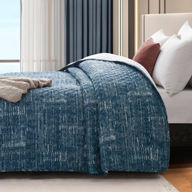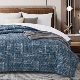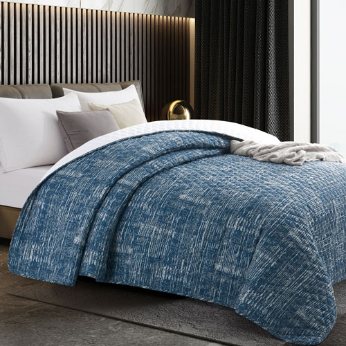 Features a basket pattern of light and dark, blues and greys. The Twilight coverlets are invitingly fresh and elegant. Ideal for warm or cool temperatures, this comfortable 100% polyester face is joined with the strength of a 100% polyester white backing. Generous 7 oz. of fiber fill in the middle. All 3 layers are lock stitch quilted in place using an industrial machine stitcher for added durability. Priced individually and sold in full cartons.