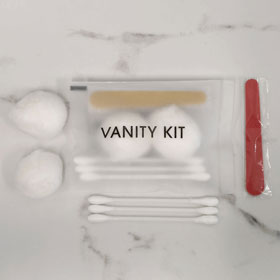 Each kit includes 3 cotton swabs, 1 nail file, and 2 cotton balls. Ideal for hotels, motels, resorts, gyms, and Air BnBs. Sealed in individual-use, frosted plastic bags. 250 kits per box.